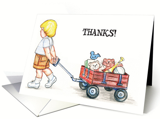 | Artist Notes: | This is a thank you card for helping someone move, featuring a little boy pulling a wagon of his toys. You can change the inside message at checkout, if you wish. 120911 |