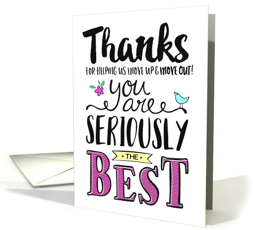 Artist Notes: | Thank someone for their moving help with this hand-lettering style typography design with the message, "Thanks for helping us move up & move out! You are SERIOUSLY the Best." Design includes bird and flower accent on white background. Inside message can be customized to fit your personal needs. |