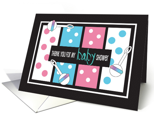 "Thank you for My Baby Shower" is the fun hand lettered wording that sits at the center of the black rectangle that tops a series of four baby-colored polka dotted pieces of wrapping paper, in the background. Three white rattles decorate the card, on top of the wrapping paper pieces. The inside wording of the card says "Baby and I appreciate your kindness hosting a shower for us so much!"