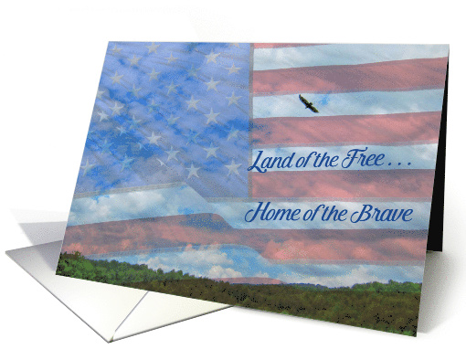 Artist Notes: | Patriotic card to support our troops or thank a Veteran has tree and flying eagle background and an United States flag in the foreground. |