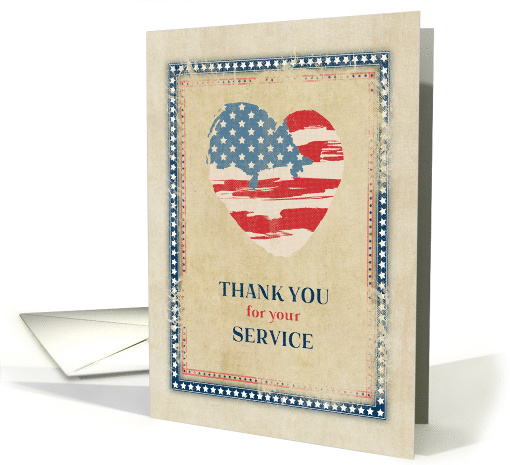 Artist Notes: | Offer thanks to a Veteran with this digitally aged and distressed look card with watercolor style heart-shaped American flag and a frame of red, white and blue stars against a parchment look background. (All effects are digitally applied.) |