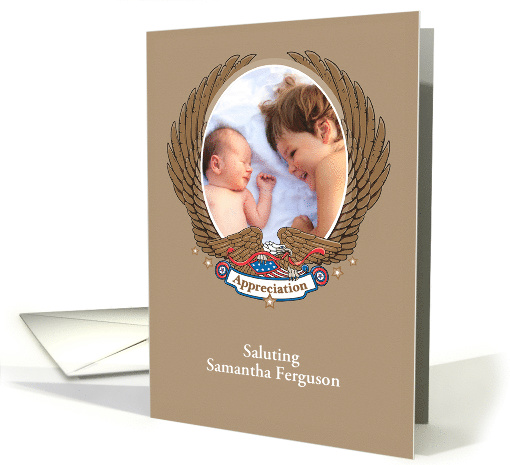 This Thank you - Appreciation Photo Card design offers customizable text and Photo card insert options to send to any Veteran - Military service - Armed forces person or anyone you wish to at all. Show your gratitude with a cherished photo and personalized text. Neutral background coloring with an American Bald Eagle - Stars + Stripes enhance an Eagle Wings - feather Oval picture frame waiting for your special image inserted. Pictures you use look best with solid color backgrounds behind the people - person. Email me here if you need any assist at all.