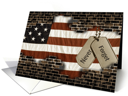 Artist Notes: | American flag and military dog tags behind brick wall for veteran thank you, |