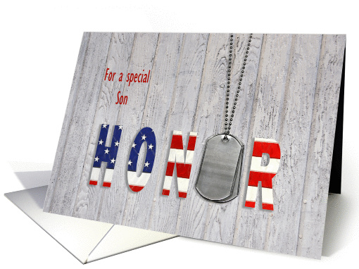 Title: | Son in military thank you-dog tags with American flag font on wood |