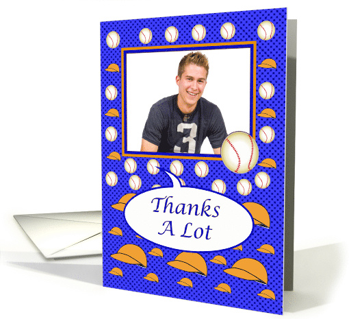 | Artist Notes: | This photo card has a square window photo with one orange and one navy blue border line, a big baseball on the right lower corner of the window photo frame, a blue background with navy blue polka dots, baseball balls, and orange caps as well as a white oval bubble with a blue line border and the expression: "Thanks A Lot." |