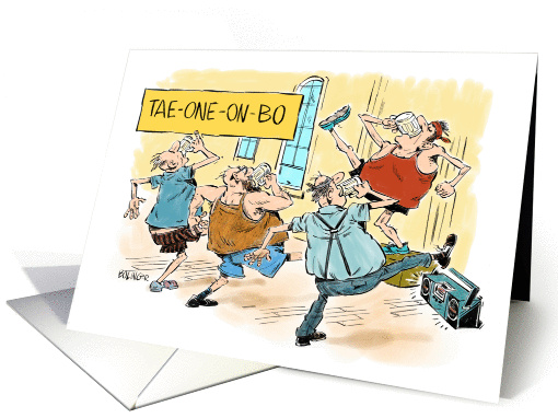 The cartoon shows an exercise gym where the program members combine aerobics, kick-boxing and wrist strengthening into one overall get-right sport. The verse inside is a thanks to your aerobics partner or instructor.