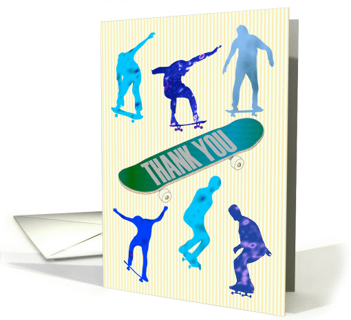 | Title: | Thank you written on a skateboard, profiles of people skateboarding |