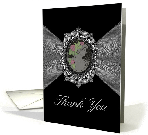 Send your formal or general Thank You's with this beautiful card design that is elegantly designed in black with a silver like fractal bow and a Cameo that has select coloring. © Copyright 2013 Madeline M Allen /SmudgeArt