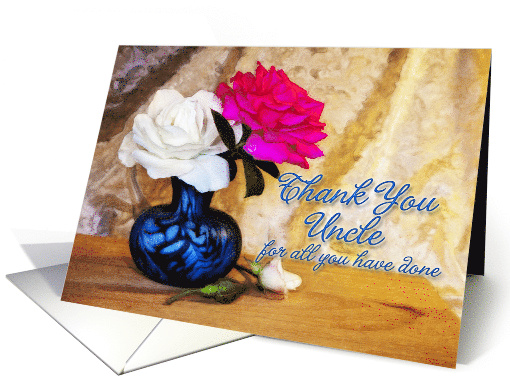 Say thank you to your uncle for everything he has done. A lovely way to send your thanks. Two beautiful full-blown roses in a lovely blue vase.