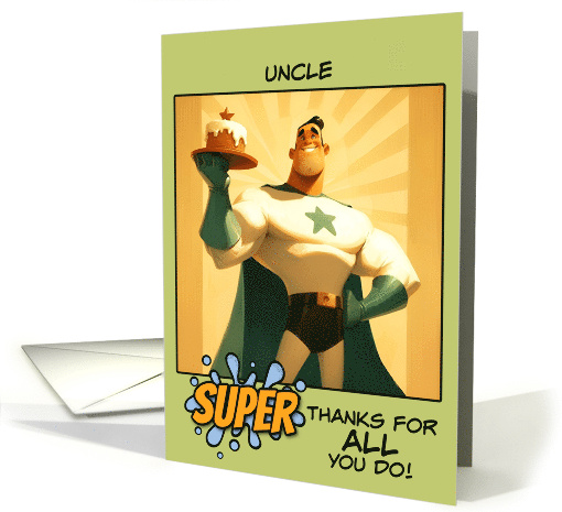 A superhero is here to serve you a delicious cake with a star on top and the text "Uncle Super thanks for all you do!" A fun design you can sent to your wonderful uncle to show your appreciation and thanks.