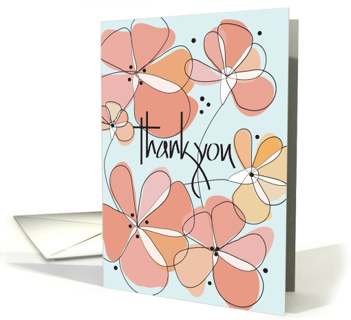 This delightfully beautiful floral thank you note from the bride of a recent wedding is perfect for her to send each of the special participants of her wedding, as a thank you for their being a part of her special day. The very soft blue card is accented with groupings of multiple colored flowers of orange that include: mango orange, mandarin orange, coral orange and soft pink orange. Dark stems and dots highlight each flower, leading to the artistically black hand lettered words, at the center, that say "Thank You". The card's inside wording says "Thank you for being in our wedding and making it so special."