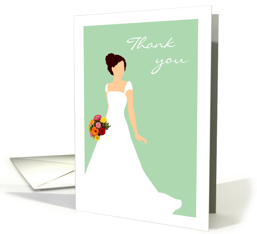 | Artist Notes: | Wedding themed thank you card with a beautiful brunette bride holding a bouquet of flowers on a mint background. |