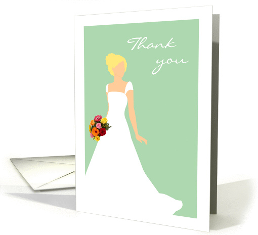 Artist Notes: | Wedding themed thank you card with a beautiful blonde bride holding a bouquet of flowers on a mint background. |