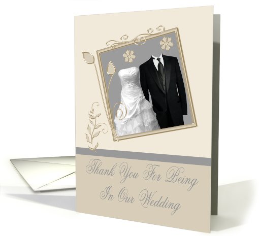 | Artist Notes: | Thank someone for being in your wedding with a card featuring a wedding gown and tuxedo in a silver, flowered frame. |