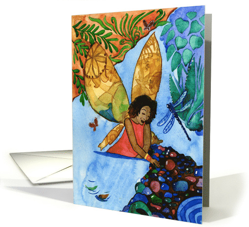 Beautiful fairy of the earth in the water. She is connected with all the elements. You can see colorful pebbles in the artwork, a flying butterfly and interesting plants.