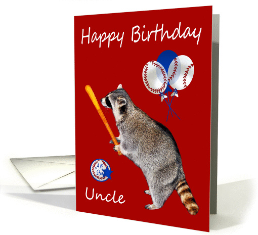 Birthday To Uncle, raccoon holding a baseball bat on red with balloons