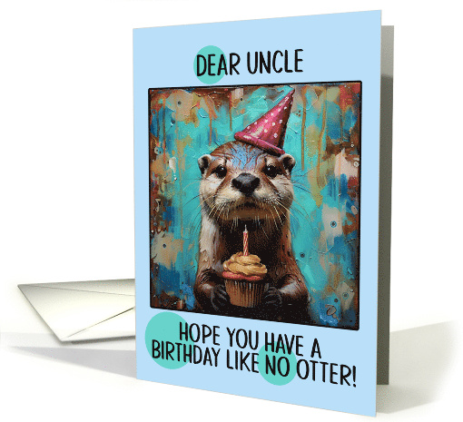This delightful birthday card features a whimsical illustration of an adorable otter wearing a festive party hat and holding a delicious cupcake. The otter's fur is rendered with impressive detail, capturing its fuzzy texture and expressive eyes. The background is a vibrant, abstract swirl of blues, oranges, and browns, creating an underwater-like atmosphere filled with bubbles and splashes. The pun at the bottom, "Hope you have a birthday like no otter!" adds a playful, humorous touch that perfectly complements the charming otter illustration. A fun card to send to your wonderful uncle.