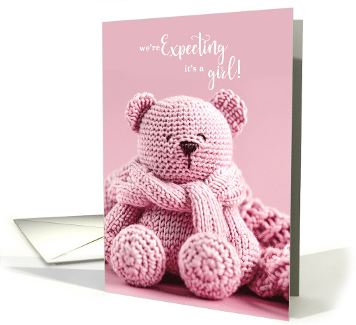 | Artist Notes: | A sweet pink crochet or knit teddy bear has a very girlie feel on this pregnancy announcement for announcing a first child is on the way. |