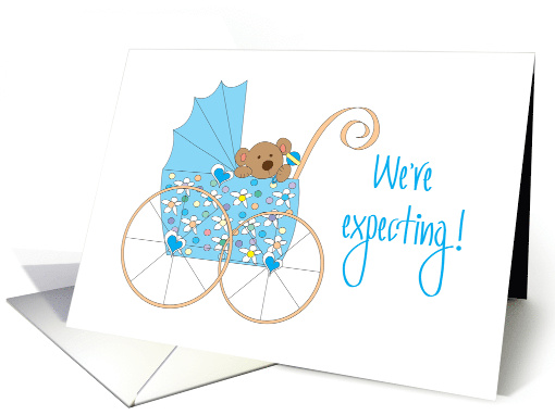 | Title: | We're expecting Announcement for Boy, Bear in Blue Floral Stroller |