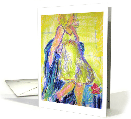 | Artist Notes: | A colorful pregnancy announcement card featuring a lovely stylized pastel painting of a pregnant woman sitting in a royal blue chair and a bouquet of red roses with a bright yellow background. |
