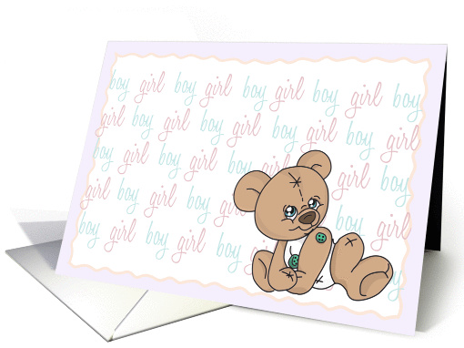 | Artist Notes: | This card features one of my designs of a cute button bear illustration sitting to the right corner and the text behind -repeated "boy" and " girl" in rows pink and blue. Perfectly cute card to announce that you are expecting a baby! |