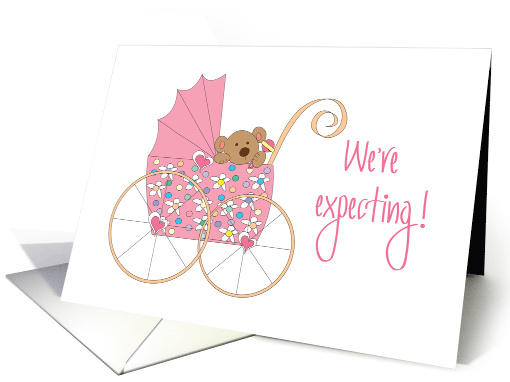 This darling announcement of the soon-to-be arrival of your new little baby girl is a fun way to share your wonderful news with friends and family. The announcement features a pink floral stroller, decorated with hearts and large old fashioned spoke wheels - holding a tiny bear with a rattle, who peeks over the edge. The announcement's message is "We're expecting!", which is written in lovely pink, handlettering on a white background. Your inside announcement continues with "A sweet little girl in on her way. We can hardly wait!"