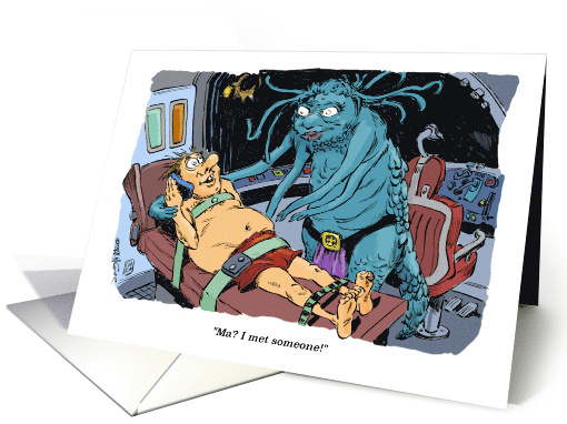 | Artist Notes: | A wide-eyed man strapped in a spaceship chair calls his mother to share exciting news . . . he’s met “someone” . . . and they are pregnant. Great announcement cart for the alien-loving couples. |