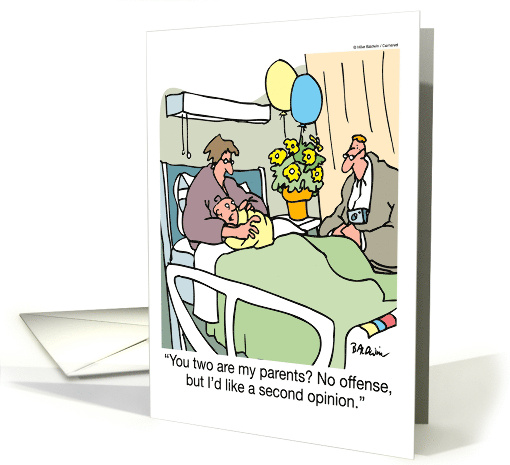 Mom with new baby at the hospital as dad looks on. The newborn says, You two are my parents? No offense, but I'd like a second opinion. Inside reads, We're having a baby – assuming the kid will have us! A fun way to announce you're pregnant and already putting the kids wants and needs ahead of your own! Thanks for checking out my greeting cards. More cards: http://www.greetingcarduniverse.com/community/store.asp?store_id=2337&gcu=42744787710&mid=cwu Cornered Books at: https://www.amazon.com/-/e/B007G2B9BO My daily cartoon: https://www.gocomics.com/cornered