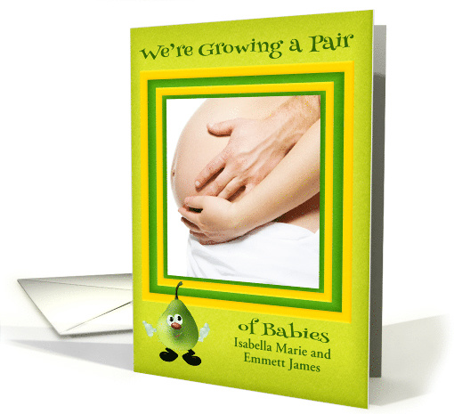 | Artist Notes: | Announce you our pregnant with twins with a humorous card with a play of words featuring an adorable pear standing in front of a colorful frame for a photo of your choice. Front has a text box for their names if you have chosen them or you can just leave it blank or perhaps a message of your choice, it's up to you. Inside, like all cards on GCU can be personalized by you as well if you wish to give it your own personal touch. Design by Laurie Schneider/Elements by La galerie de Jackie/Diana'z Designz |