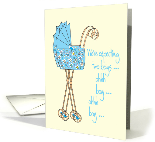 | Artist Notes: | Twin boys! Let everyone know that your family will soon have a pair of twin boys in it, by sharing this charming announcement with all. The duplicate blue floral strollers anchor the left side of the announcement with old fashioned baby fun and to their right are the hand lettered words "We're expecting twin boys ... ohhh boy ... ohhh boy ..." The inside completes your announcement with the words "and we're thrilled!" |