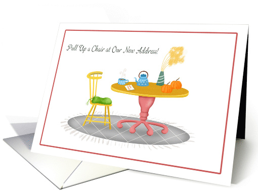 | Artist Notes: | This cozy new address card showcases a wooden table adorned with mini pumpkins, a teapot and teacup, and a “We’ve Moved” postcard perfect for announcing a recent move with warmth and charm. |