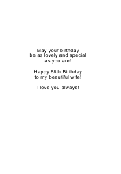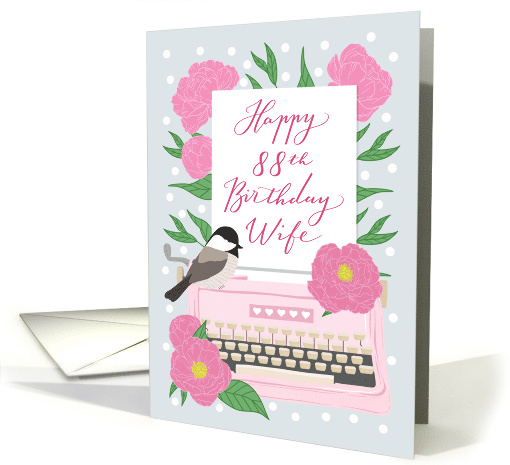 A pink vintage typewriter surrounded by flowers and leaves with a chickadee bird perched on the typewriter. A piece of paper from the typewriter has the handwritten words Happy 88th Birthday Wife. A lovely birthday card for your wife turning 88!