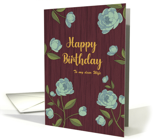 This is an elegant and sophisticated birthday card designed for a Wife. It has a dark burgundy wood textured background, highlighting the delicate peonies in greenish-blue tones with green leaves. The golden typeface in manuscript style adds a warm and refined touch to the "Happy Birthday - For My Wife" message.