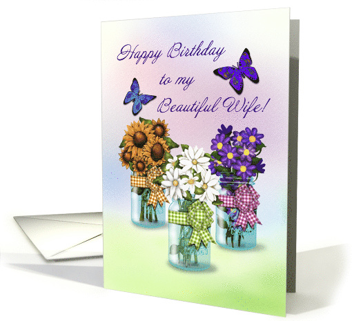 Three clear aqua jars with flowers in them, sunflowers, daisies and violets, are the focal point of this pretty birthday card for a wife. With two butterflies flying above and in between the text that says 'Happy Birthday to my Beautiful Wife!