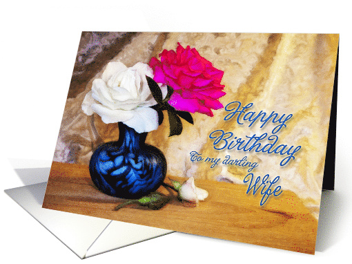 Send a card full of roses to say happy birthday to a darling wife. A lovely way to send your birthday wishes. Two beautiful full-blown roses in a lovely blue vase.