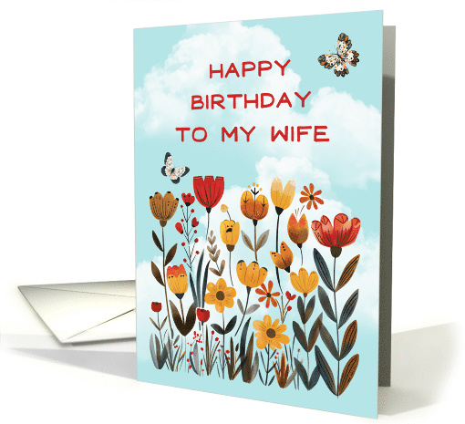 Give your wife a special birthday greeting with this pretty and whimsical assortment of yellow and orange flowers with a pair of colorful butterflies flying in the clouds.